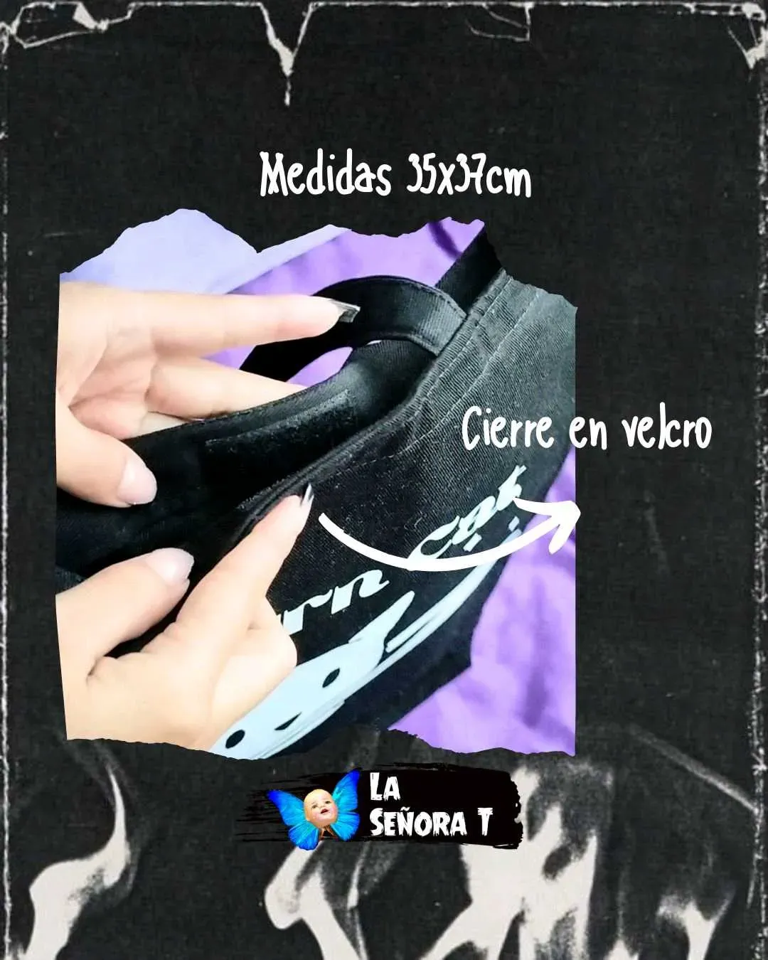 Totebag negra en drill de alto gramaje con cierre en velcro para mayor seguridad. Medidas 35x37cm.
